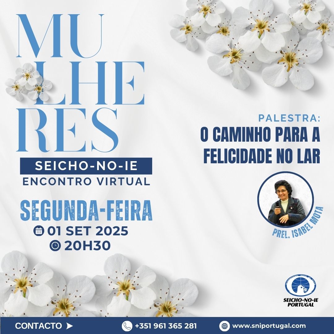🌸 Convite Especial – Reuniões de Mulheres 🌸Seicho-No-Ie de Portugal Querida família Seicho-No-Ie, Com profundo amor e gratidão, convidamos você para participar das Reuniões da Pomba Branca Virtual — momentos de luz, oração e dedicação ao bem de toda a humanidade. Esses encontros são uma verdadeira oportunidade de elevar nossa consciência, fortalecer nossa fé e irradiar […]